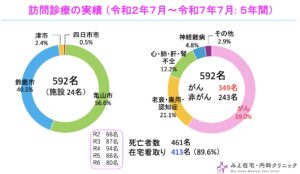 さて、令和2年7月3日に「みえ在宅医療クリニック」として開院してから約5年6ヶ月が経過しましたが、先日、亀山市の在宅医療多職種研修会において当院の5年間のデータについて発表する機会をいただきましたので、今日はこの場でお示ししたいと思います。