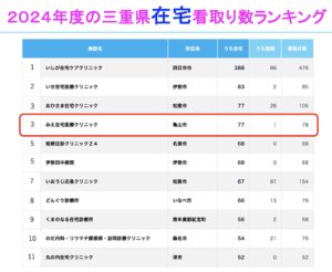 在宅医療は決して看取りのためだけの医療ではありませんが、「看取り数」という数字はそれぞれの在宅クリニック(在宅療養支援診療所)の活動性を示すためにわかりやすい指標(メルクマール)ではあるため、巷には厚生局への報告をもとにした「看取り数ランキング」が存在しています。おかげさまで当院もランクインしておりますが、驚きなのは年間50名以上のお看取りをしているクリニックが三重県でも10箇所以上存在していることです。5年前には考えられなかったことで、三重県の各地域でもこの数年間で在宅医療が普及してきているようで、ありがたいと思います。
